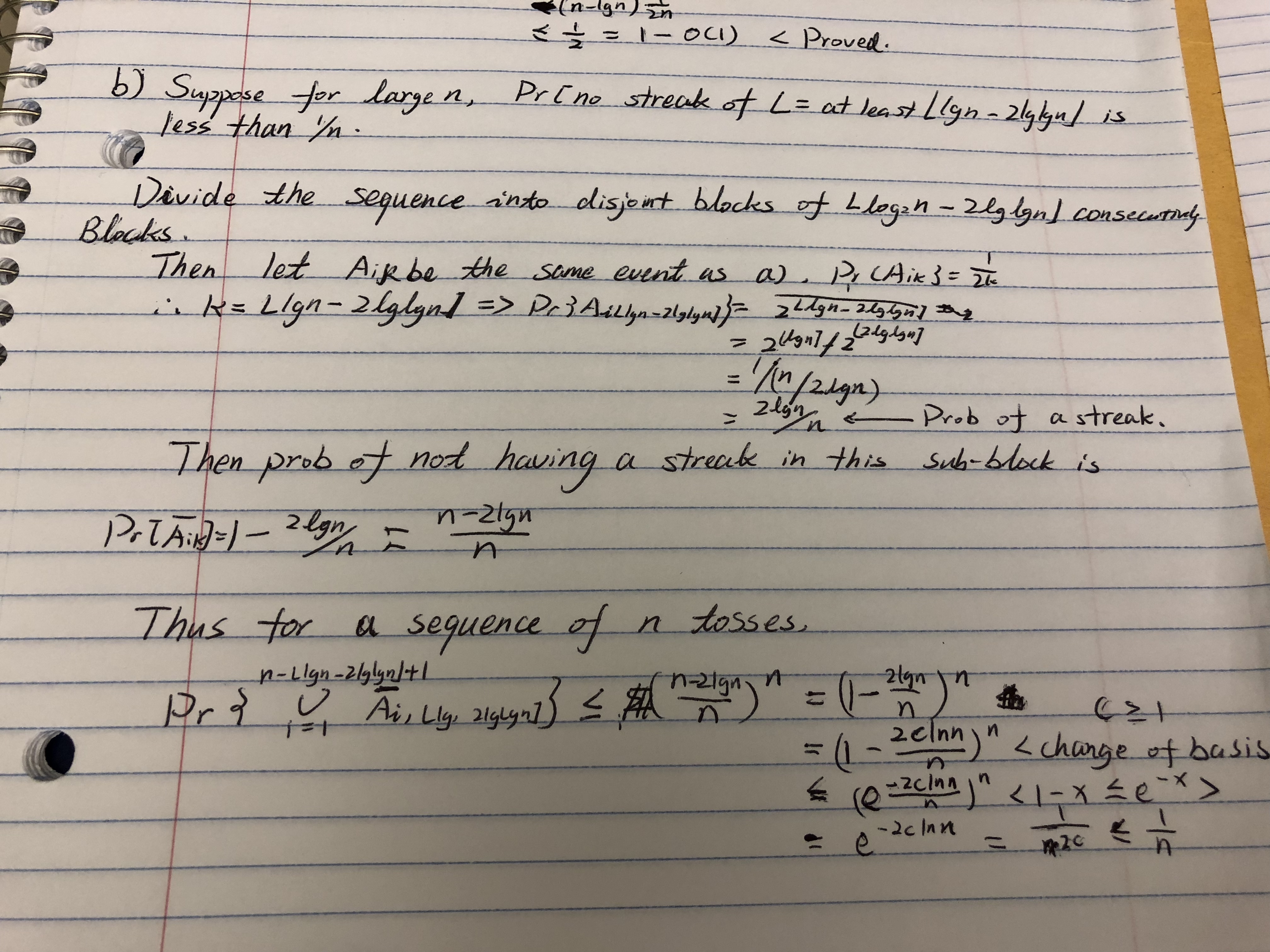 Sharpen the lower bound on streak length by showing that in n flips of a fair coin, the probability is less than 1/n that no streak longer than lg n-2 lg lg n consecutive heads occurs.