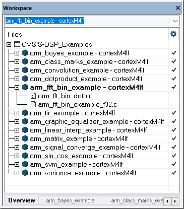 The CMSIS-DSP_Examples.eww workspace comes with a dozen of projects; each of which exploring a different functionality provided by the CMSIS-DSP Library.