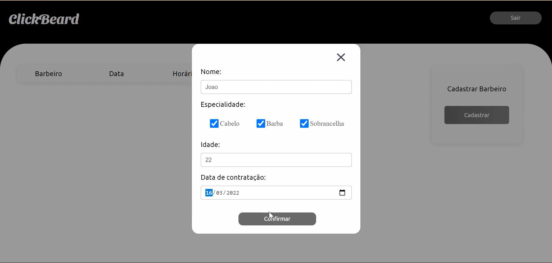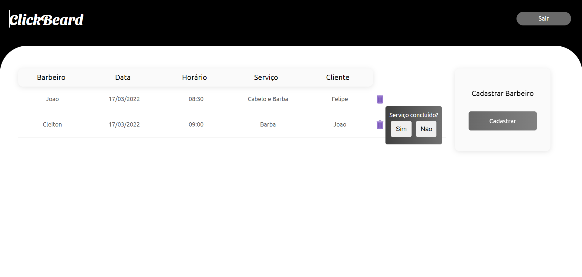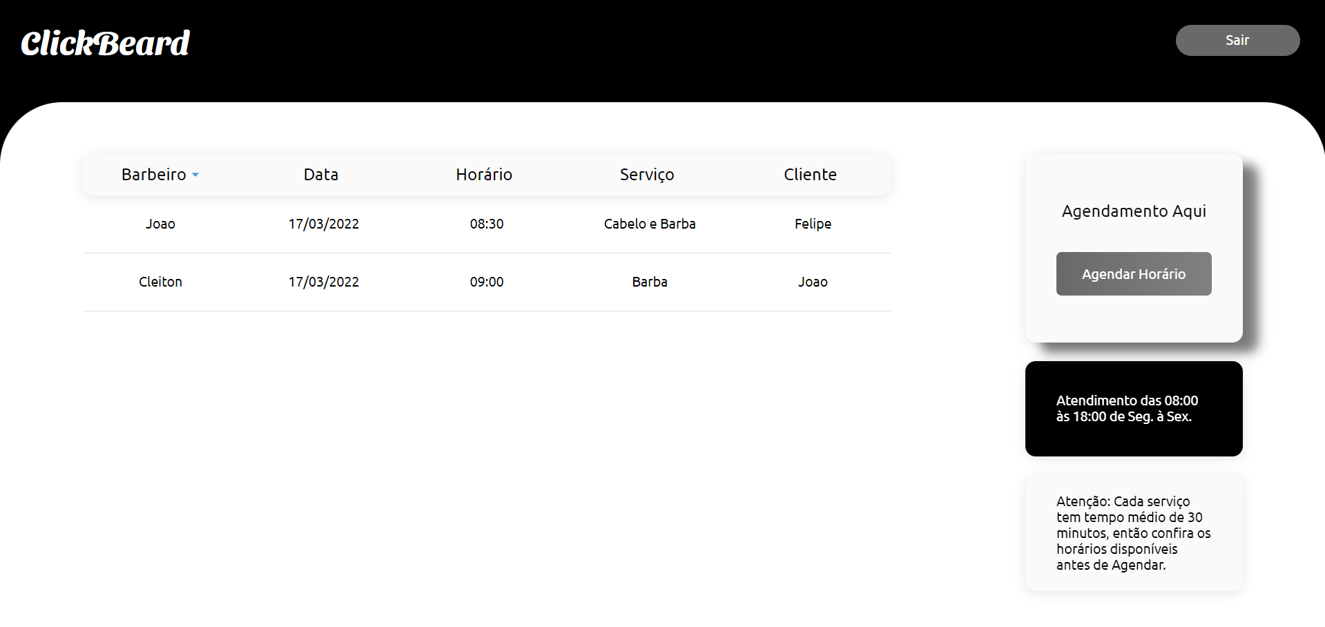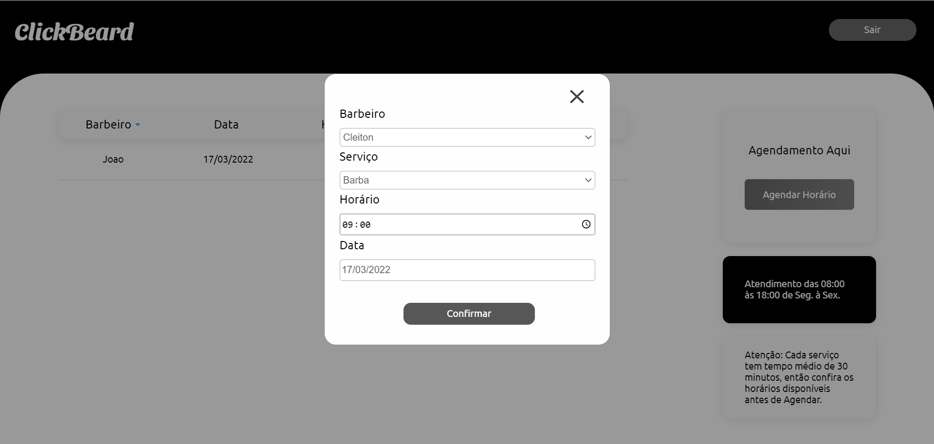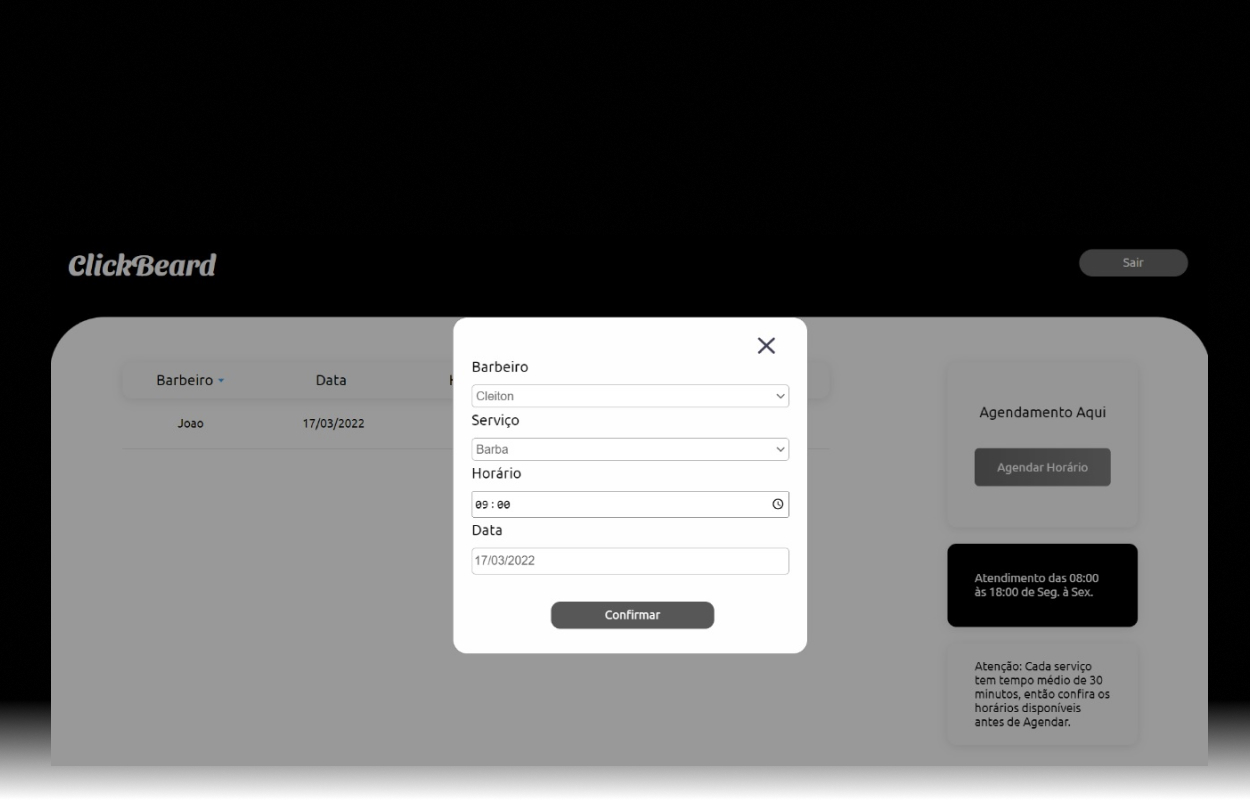 O projeto consiste em um sistema de agendamento e de controle sobre as demandas de serviço numa barbearia, onde o administrador poderá consultar todas os agendamentos, visualizar datas, horários, além de poder baixar agendamentos caso tenha concluído e cadastrar seus Barbeiros com nome, idade, serviço e data de contratação. O sistema também dá a opção de entrar como cliente, no qual deverá ser efetuado um cadastro com informações de nome, e-mail e senha. A tela do cliente consiste em visualizar todos os agendamentos e avisos sobre horários de funcionamento do estabelecimento e tempo de serviço, terá também a opção de poder efetuar o Agendamento.