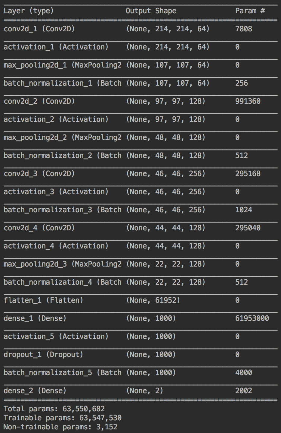 The learning model is based on the AlexNet image classification network (Original author's presentation from ImageNet), although it has been a bit trimmed to bring down the number of training parameters (currently at ~63.000.000 trainable params).