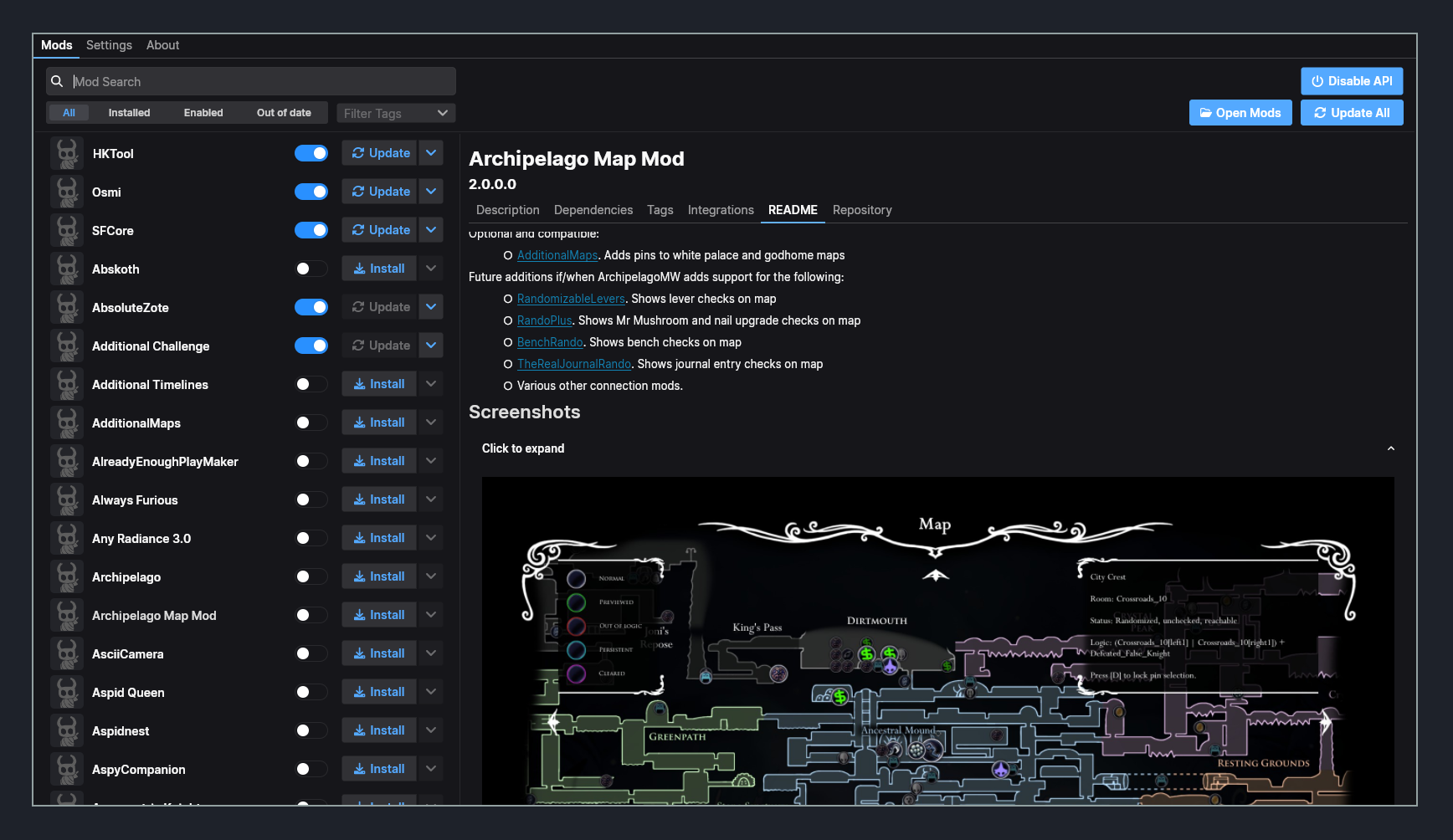 Scarab This is a mod manager for Hollow Knight aimed at making the process of installing mods easier for users. Usage Get the latest release here. Unzip and run it. Mods appear in the top left corner of the game title screen after installation.