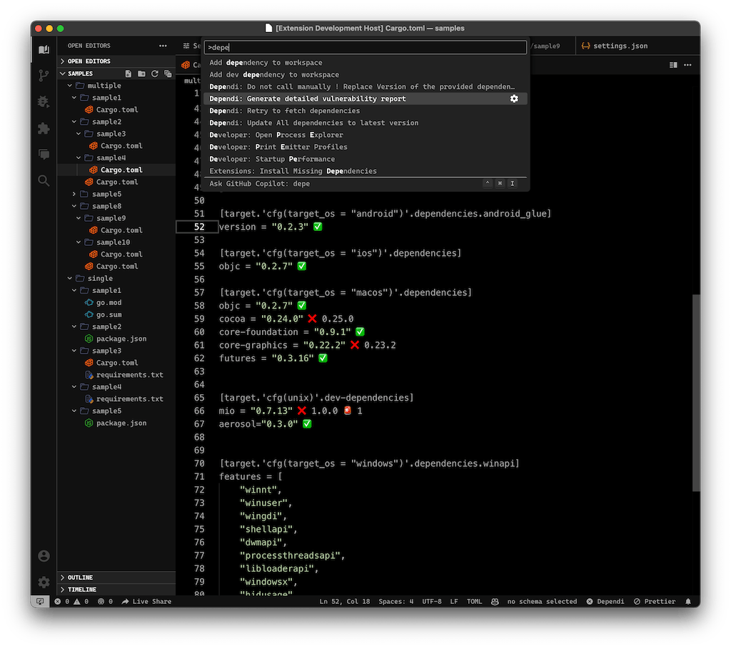 Dependi is a comprehensive dependency management extension that helps developers write code faster and smarter by efficiently managing project dependencies. Formerly known as Crates the most loved and used dependency management extension for Rust. Dependi now supports multiple languages including Rust, Go, JavaScript, TypeScript, Python, PHP, Dart and C#.