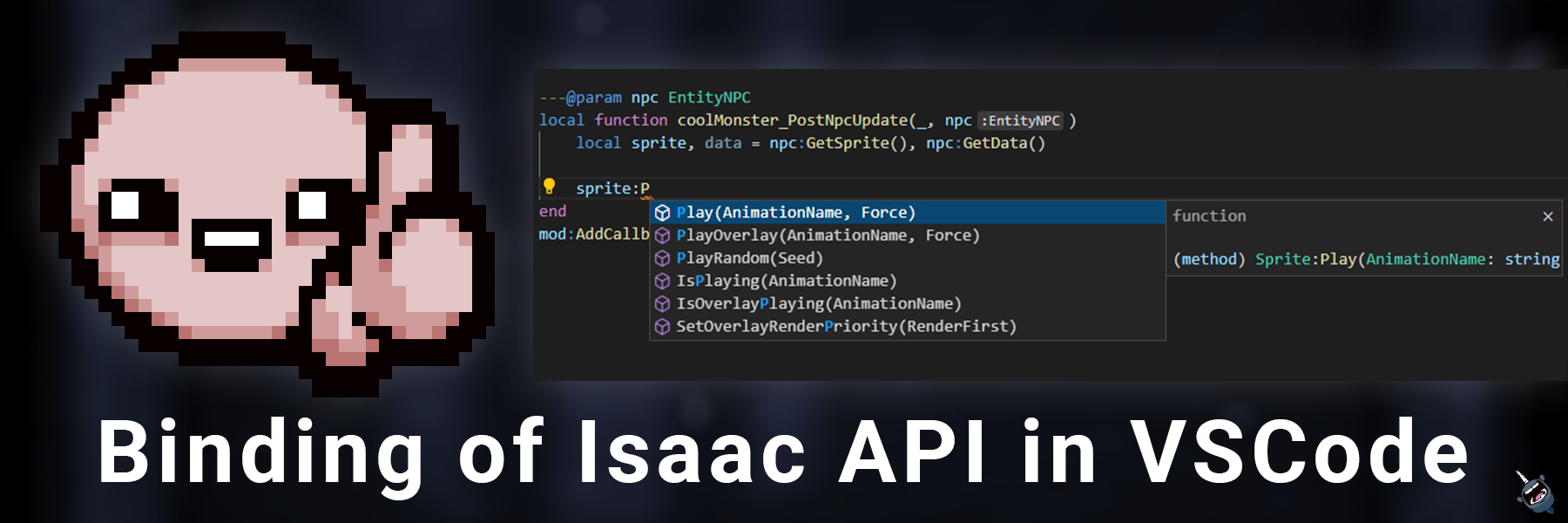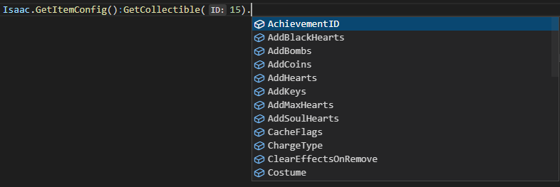This extension uses the Lua Language Server by Sumneko to add autocomplete for The Binding of Isaac: Repentance's modding API with EmmyLua annotations.
