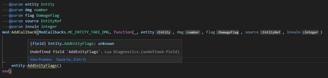 local myCallbackFunction(_, npc, intParameter, source)Autocomplete should work with the type specifications too, so it shouldn't be too annoying. You should also do this for any other function where you want the autocomplete to work on its params, also adding ---@return for return types.