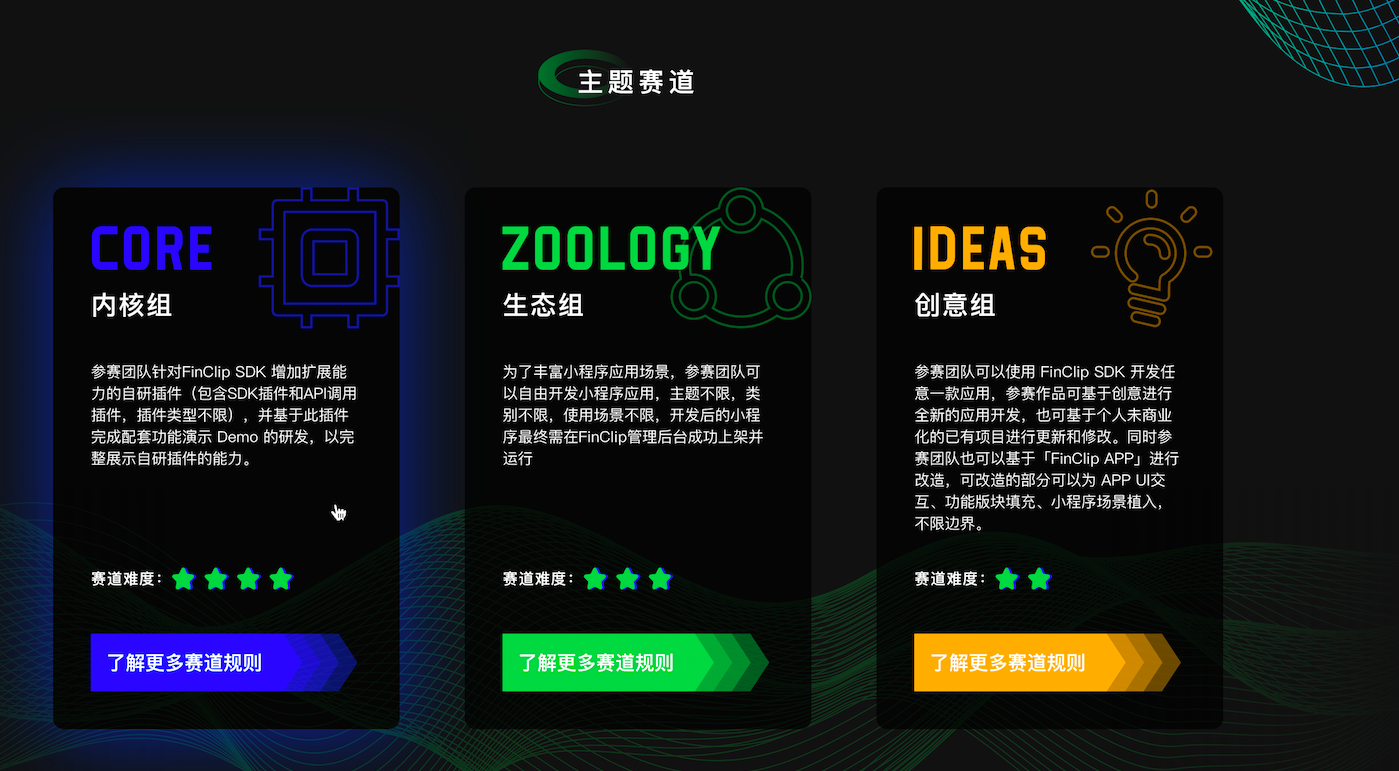 我们用 Hacking 连接更广泛的生态,给予参赛者尽情发挥的想象空间。本届 Hackathon 我们一共包含三大主题赛道(内核组、生态组、创意组),尽可能的让你们可以找到大显身手的机会,参赛者不论是 APP 开发者、小程序开发者、产品经理或者 UI 交互设计师,都可以找到适合的领域,围绕 FinClip 探索无限可能。