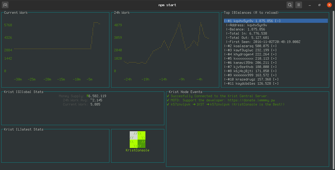 Cool Krist Dashboard made with blessed.js and blessed-contrib among other things :)