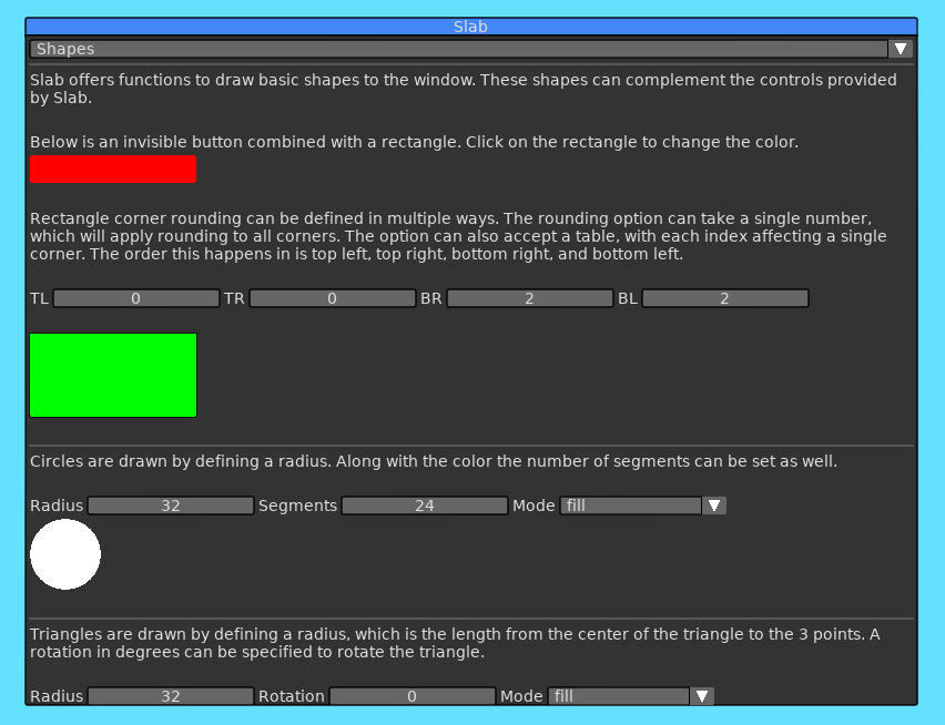 Slab offers functions to draw basic shapes to a window. These shapes can complement the controls and provides some flexibility in the look the UI. For example usage of these shapes, refer to the Shapes section of the SlabTest window.