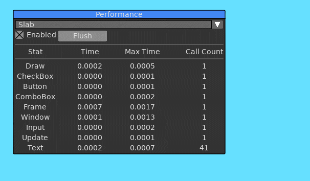 The Slab API offers functions that track the performance of desired sections of code. With these functions coupled together with the debug performance window, end-users will be able to see bottlenecks located within their code base quickly. To display the performance window, call the SlabDebug.Performance function.