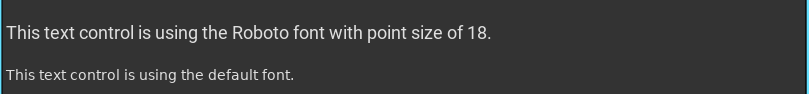 Fonts can be pushed to a stack to alter the rendering of any text. All controls will use this pushed font until the font is popped from the stack, using the last pushed font or the default font. Below is an example of font being pushed to the stack to render a single text control and then being popped before the next text control.