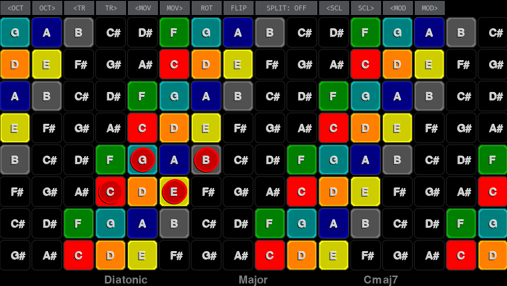 By default, the C major scale is colored. You can highlight different notes by cycling the scale (SCL) and mode (MOD) buttons. Notice how only the colors change, and not the note positions.