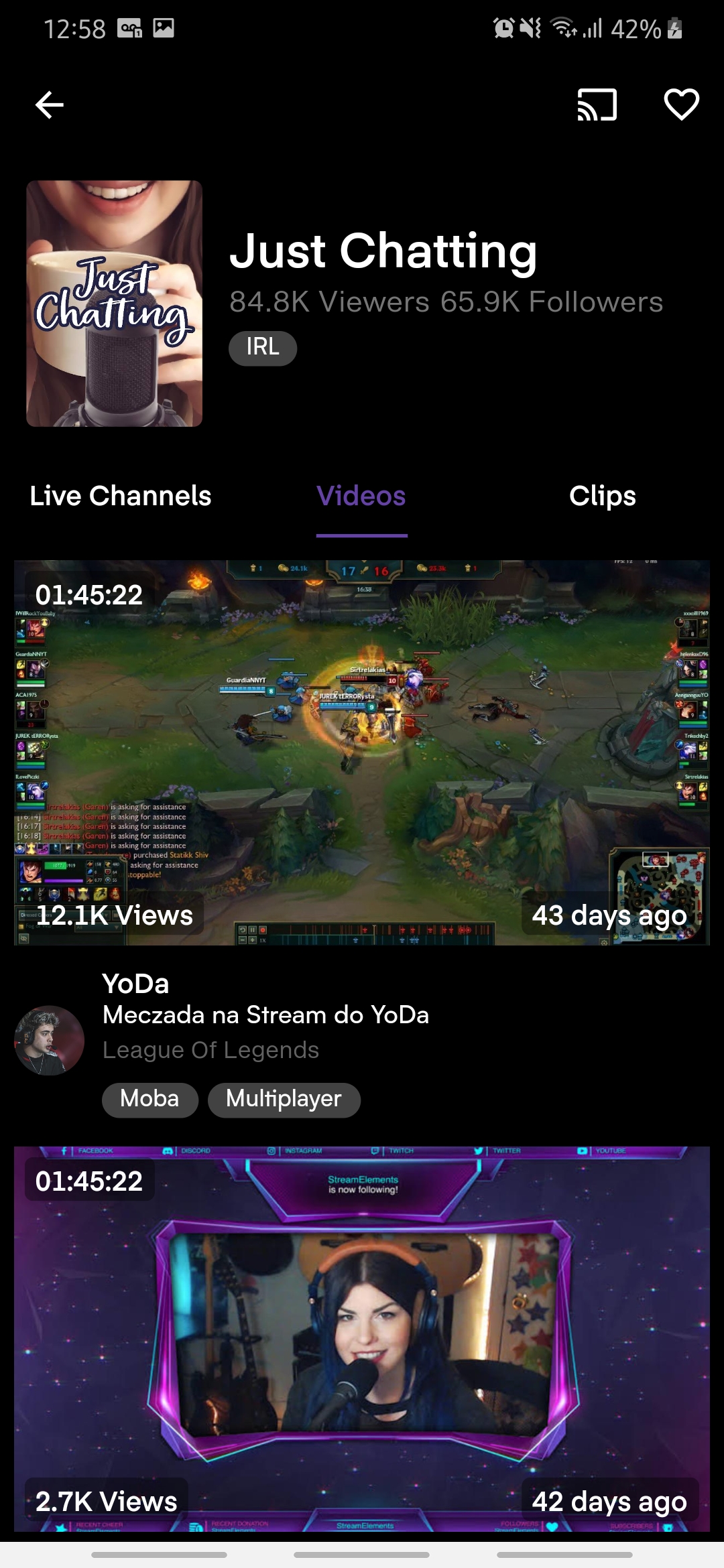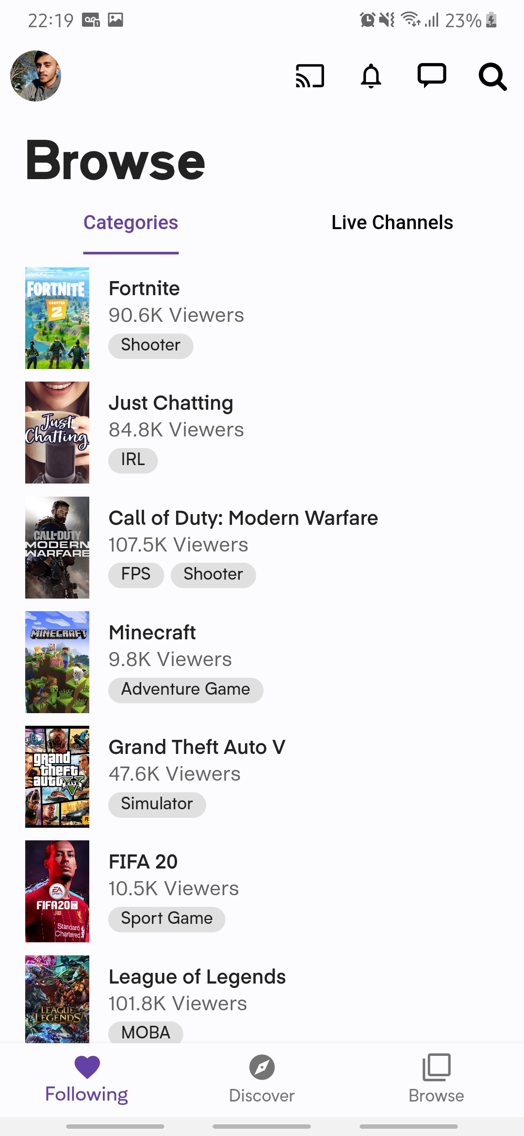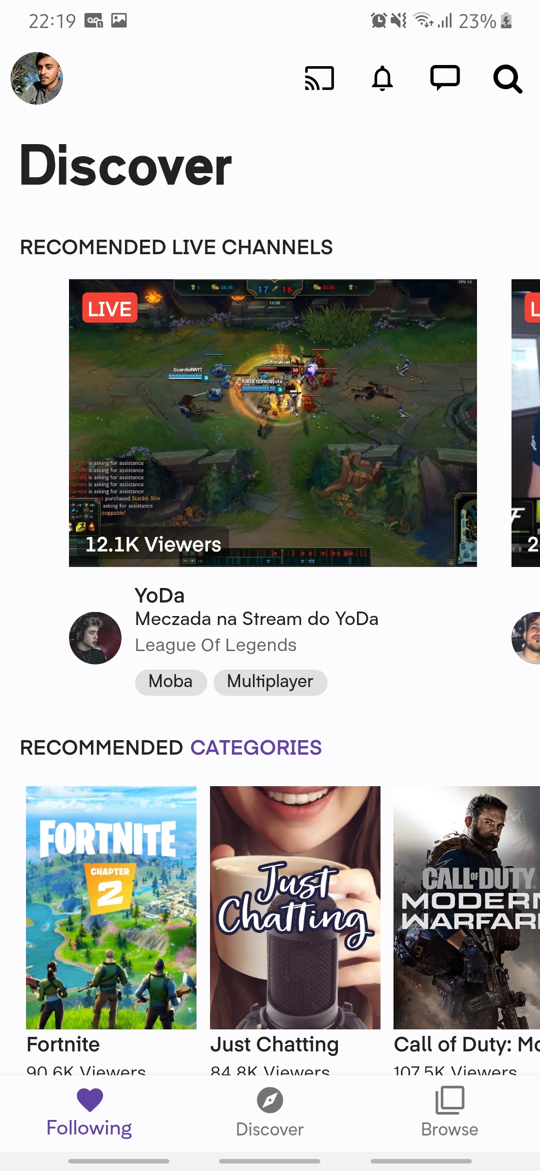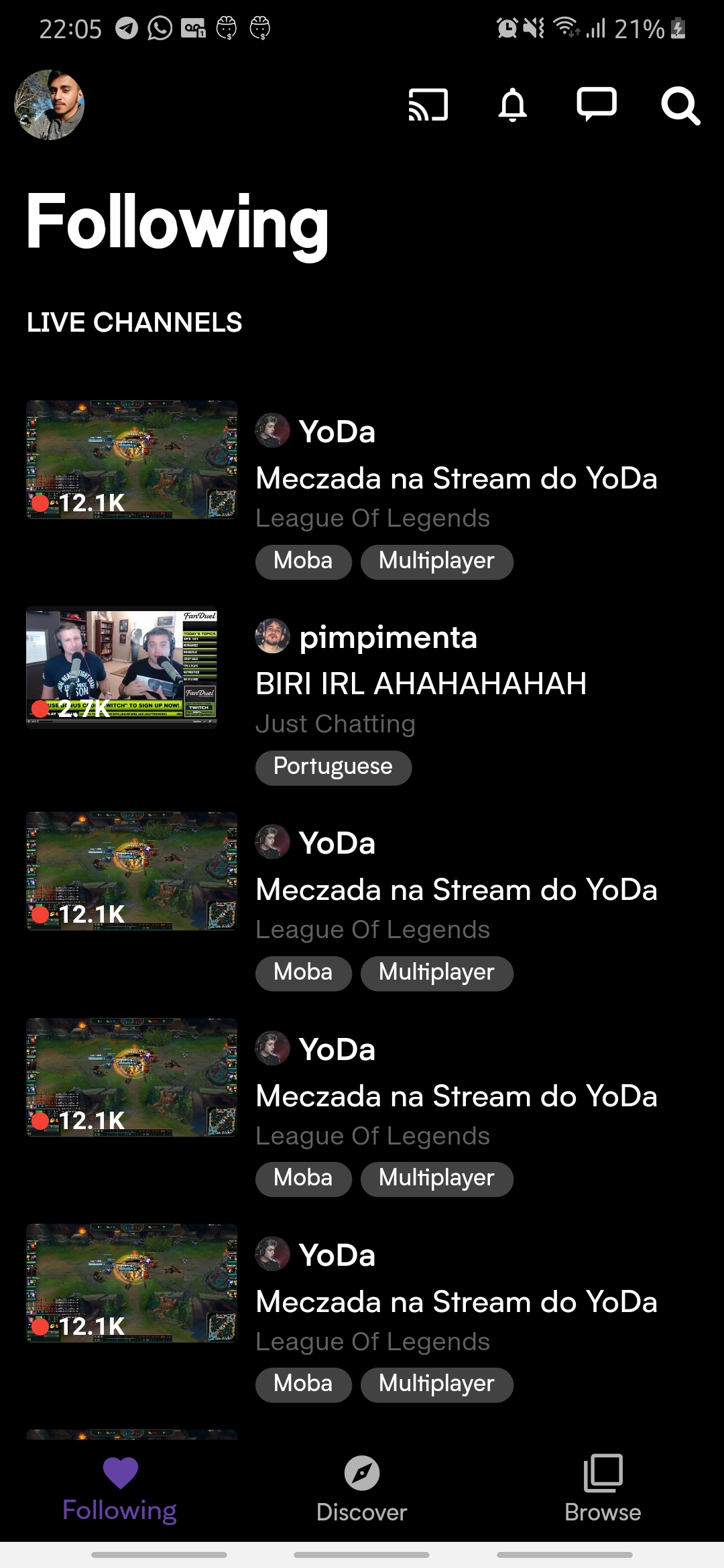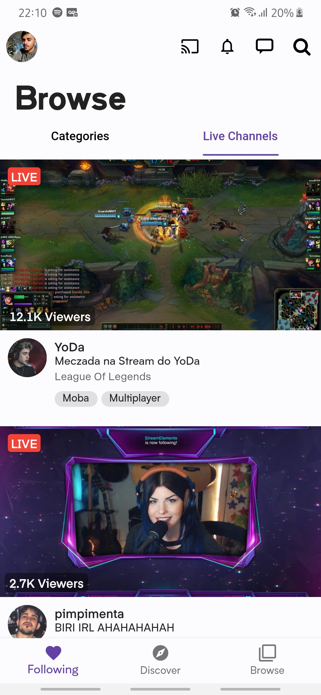 Representação do aplicativo mobile da plataforma de stream Twitch.TV ©. Este app é apenas para estudos, sem nenhum fim lucrativo.