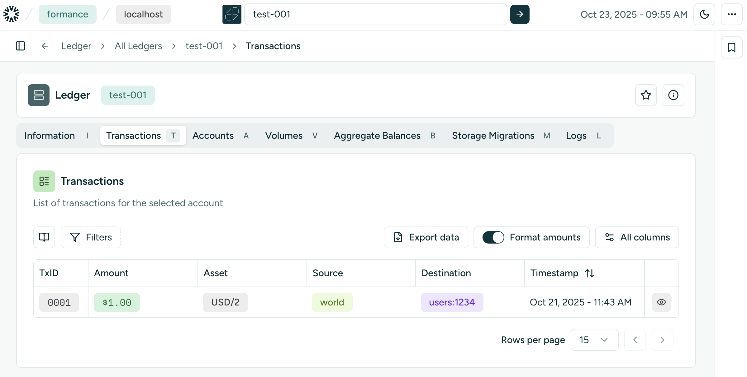 http POST :8080/api/ledger/v2/quickstart/transactions postings:='[{"amount":100,"asset":"USD/2","destination":"users:1234","source":"world"}]'And get a visual feedback on the Ledger Console UI started on http://localhost:3000/formance/localhost?region=localhost: