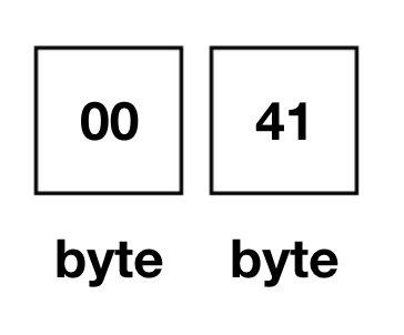 그리고 위의 경우에는 첫번 째 byte를 모두 0으로 채웁니다. 두번 째 바이트는 16진법으로 표현했을 때 41(이진법으로 1000001)이 들어오게 됩니다.