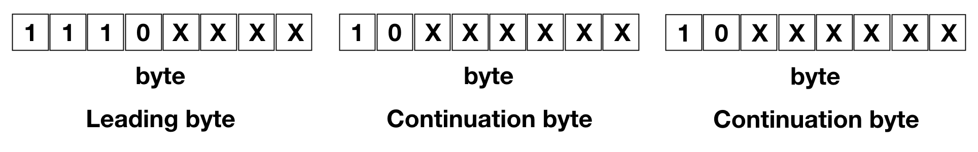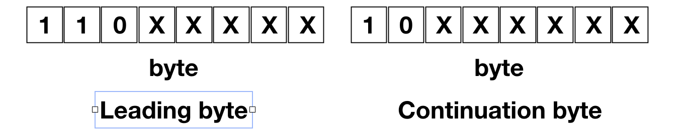 Leading byte -> 어떤 byte로 인코딩 되었는지 알려준다. 110으로 시작하면 2bytes로 인코딩 되었다는 것을 의미한다. continuation byte -> Leading byte 뒤에 따라온다. continuation byte의 맨 앞 부분은 10으로 표기된다.