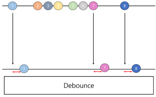 ๋๋ฐ์ด์ค๋ ์งง์ ์๊ฐ ๊ฐ๊ฒฉ์ผ๋ก ์ด๋ฒคํธ๊ฐ ์ฐ์ํด์ ๋ฐ์ํ๋ฉด ์ด๋ฒคํธ ํธ๋ค๋ฌ๋ฅผ ํธ์ถํ์ง ์๋ค๊ฐ ์ผ์ ์๊ฐ์ด ๊ฒฝ๊ณผํ ์ดํ์ ์ด๋ฒคํธ ํธ๋ค๋ฌ๊ฐ ํ๋ฒ์ ํธ์ถ๋๋๋ก ํฉ๋๋ค. ์ฆ, ๋๋ฐ์ด์ค๋ ์งง์ ์๊ฐ ๊ฐ๊ฒฉ์ผ๋ก ๋ฐ์ํ๋ ์ด๋ฒคํธ๋ฅผ ๊ทธ๋ฃนํํด์ ๋ง์ง๋ง์ ํ๋ฒ๋ง ์ด๋ฒคํธ ํธ๋ค๋ฌ๊ฐ ํธ์ถ๋๋๋ก ํ๋ค
