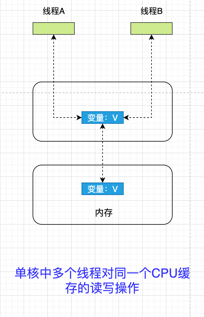 线程A 和 线程B 都操作同一个 CPU 里面的缓存,所以线程A 更新了 变量 V 的值,那么线程B 之后访问变量V 得到的一定是 V 的最新值。(线程A 写入的值)