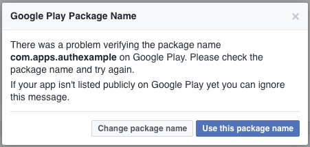 There was a problem verifying the package name com.apps.authexample on Google Playyou can safely ignore this error and click theuse this namebutton if you are currently in the developement stage.