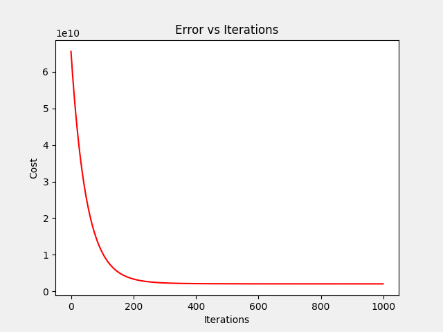 return cost, errorFor gradient descent to work with multiple features, we have to do the same as in simple linear regression and update our theta values simultaneously over the amount of iterations and using the learning rate we supply.