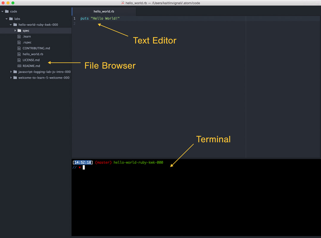 When you open the Learn IDE, you'll see three main components: the file browser, the text editor and the terminal. Let's talk about each of those.