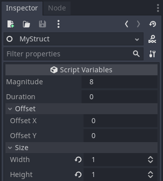 group = "..."arg is easy to typo, which will ruin the grouping of items. Likewise, property names are only conventionally grouped by a prefix.Nilwhich provides a name for the group. In the example,sizeandoffsetare both group names, created automatically by the property attribute using the field name as the property's name. TheGroupMarkertype is just a way to feed theNilvalue to Godot.GROUPusage flag enabled will become a member of that group. (See the linked GDScript documentation.)hint_stringis provided on the property with theGROUPflag: In this case, only properties whose name matches the given hint prefix will become group members. Any other properties will "move" to the top of the list outside of any group. This behavior is surprising, and any number of bugs can cause this to happen by mistake.With structural declaration, the example could possibly look like this: