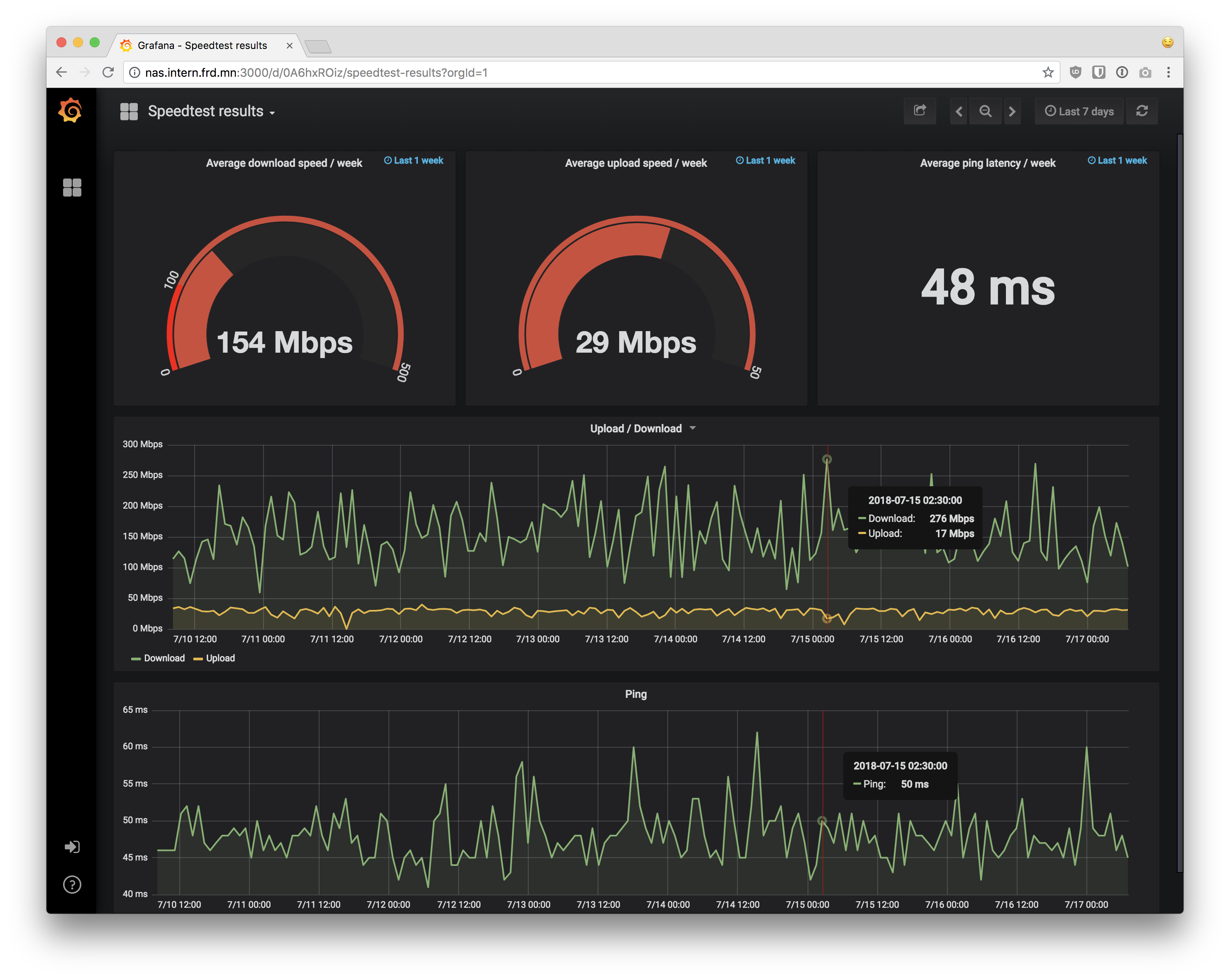 $ docker-compose up -d$ docker-compose logs -f$ docker-compose logs -f grafanaBy default the dashboard shows all speedtest results. To filter for a specifc host, simply add a and host = 'local' statement in the WHERE clause of the SQL select.