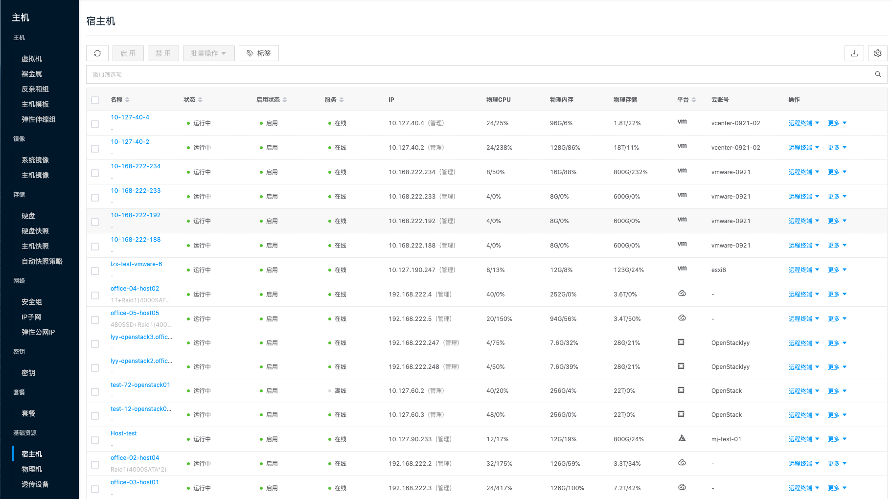- Servers: instances, disks, network interfaces, networks, vpcs, storages, hosts, wires, snapshots, snapshot policies, security groups, elastic IPs, SSH keypairs, images