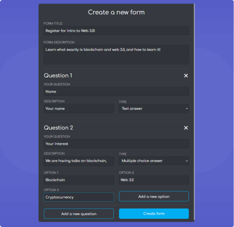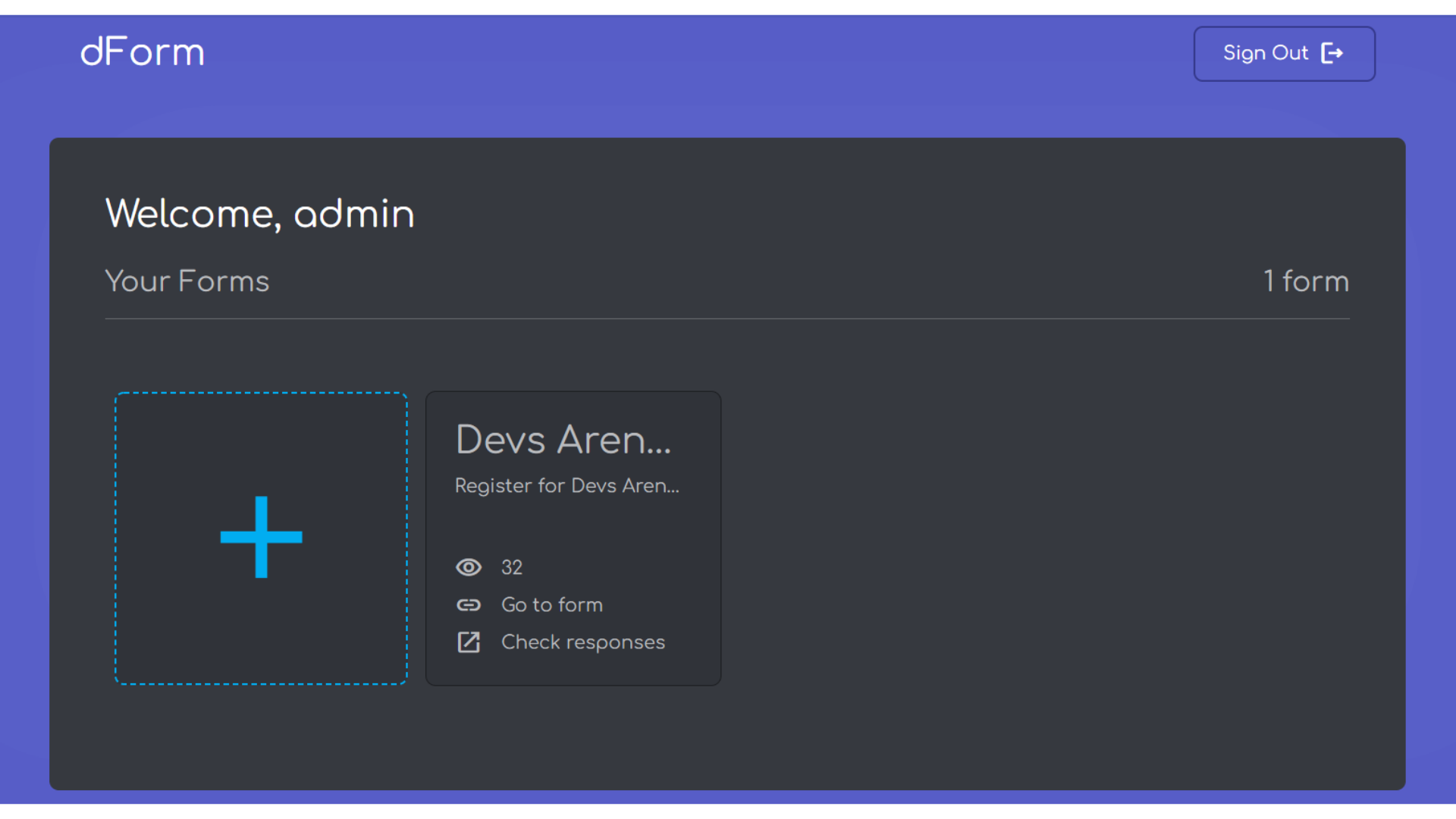 dForm is an open-source, secure way of creating and managing responses of your forms. It also gives you metrics such as times your form was viewed and submitted. dForm uses fully responsive UI similar to Discord, and Material UI, and also keeps your session secure with JWT authentication with each request!
