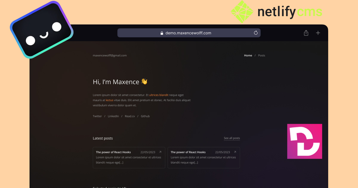 datafolder (presentation, social links, projects list, colors). - You can write articles in