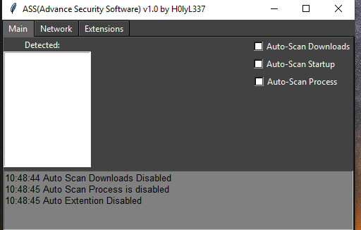 ASS stands for advance security software :) A program that gets the signatures of running processes, Downloaded files etc, and compares them to a hash database, or uploads the signature to an virus-total API. you have to set up a database for the application to run properly or edit the code to just upload to virus-total