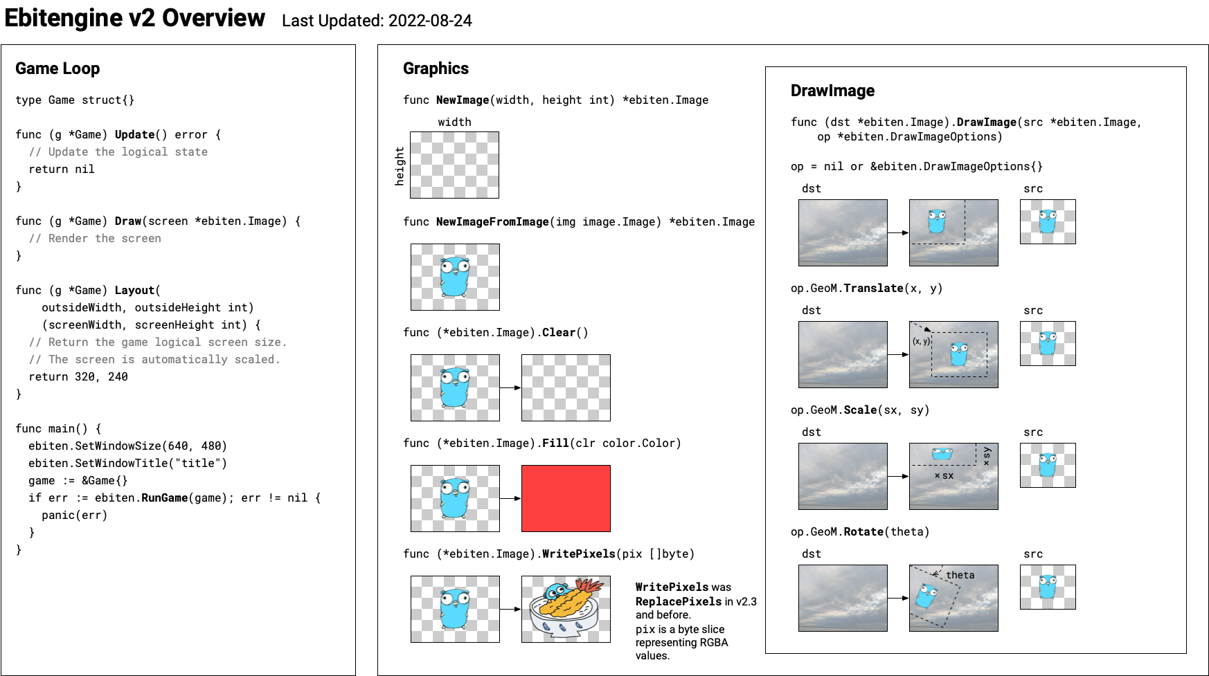 Ebitengine (formerly known as Ebiten) is an open source game engine for the Go programming language. Ebitengine's simple API allows you to quickly and easily develop 2D games that can be deployed across multiple platforms.