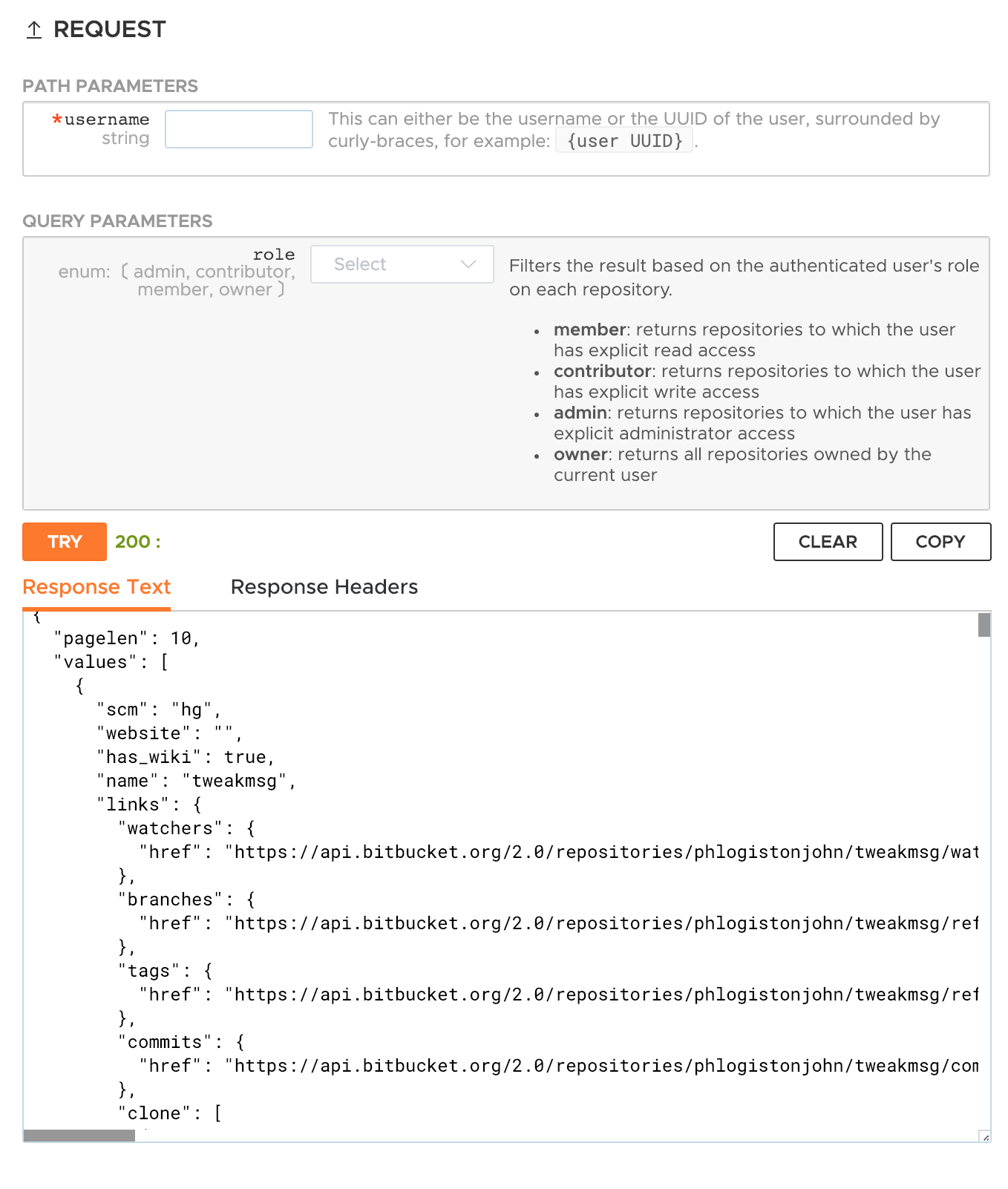 Built in console, fields are pre-filled with values if exist in spec, request body is generated and filled based on schema, allowing you to quickly try out the end-point with a single click