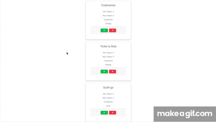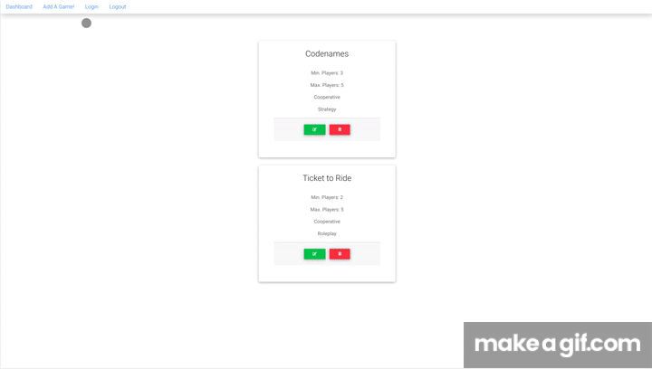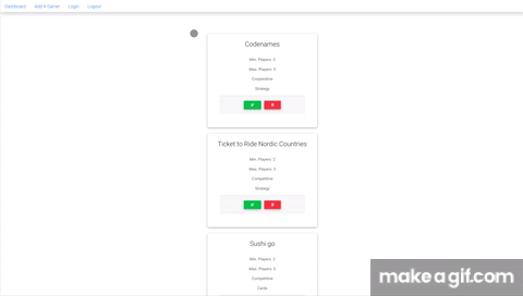 To add a game to your game closet, simply click on "Add A Game" from the dashboard. When the add-game form appears, enter the details of your game (name, minimum and maximum players, whether the game is competitive or cooperative, and choose a category from the drop-down menu). When you are done, click "Submit". Voila! Your game is now saved to your closet.