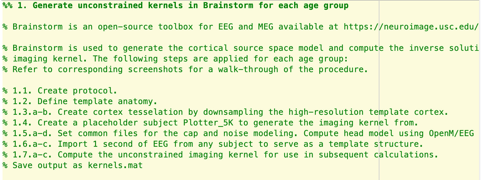 The first section of this program includes instructions on how to create the source models/kernels in Brainstorm using child brain templates (O'Reilly et al., 2021, NeuroImage; Richards & Xie, 2015, Advances in Child Dev and Beh). We also made pictures showing the steps to create source/head models in Brainstorm. They can be downloaded from the Sourcemodels/pl_aac_sourcemodels/ folder.