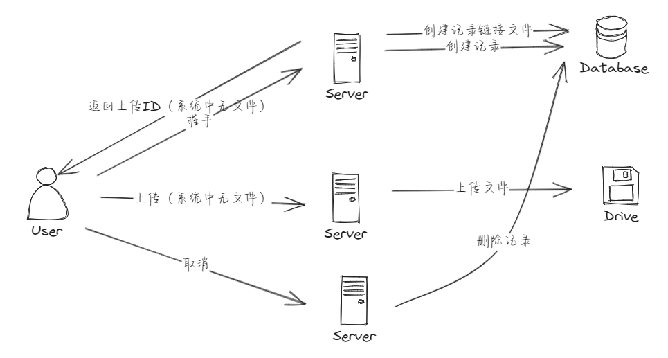 - 握手:系统应该判断是否有该文件的记录,如果有,直接使用该文件的md5,即在数据库中写入一条记录作为软连接;如果没有,则创建该记录,并返回给前端,前端再上传文件