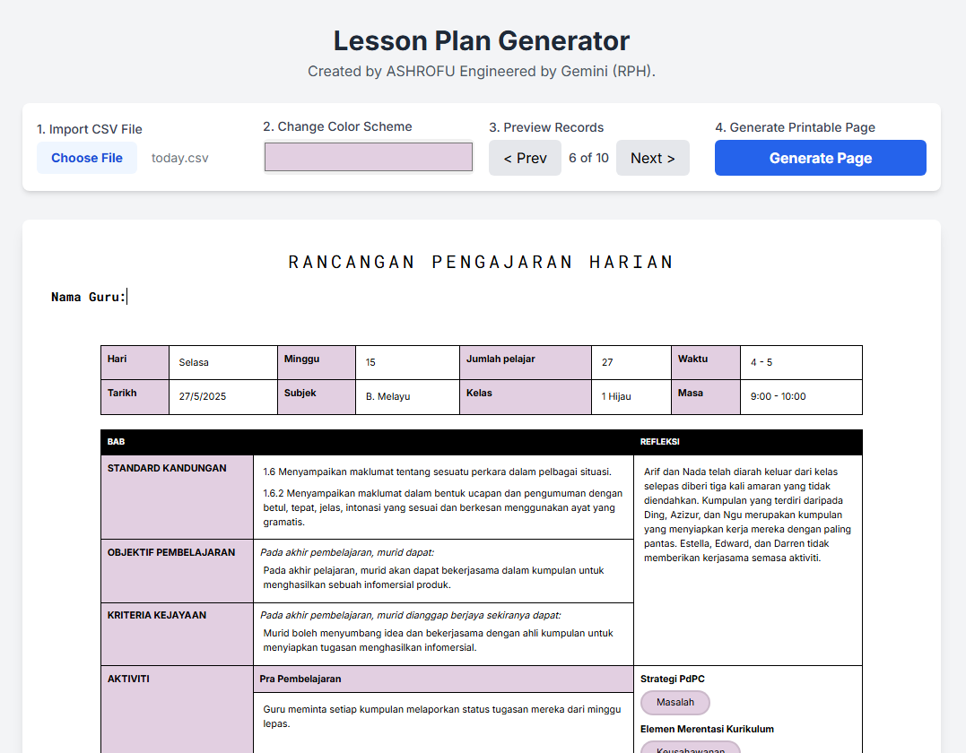 A simple, powerful, single-page web application to quickly generate and customize daily lesson plans (Rancangan Pengajaran Harian - RPH) from a CSV file. This tool is designed to streamline the lesson planning process for teachers, allowing for bulk creation and easy printing.