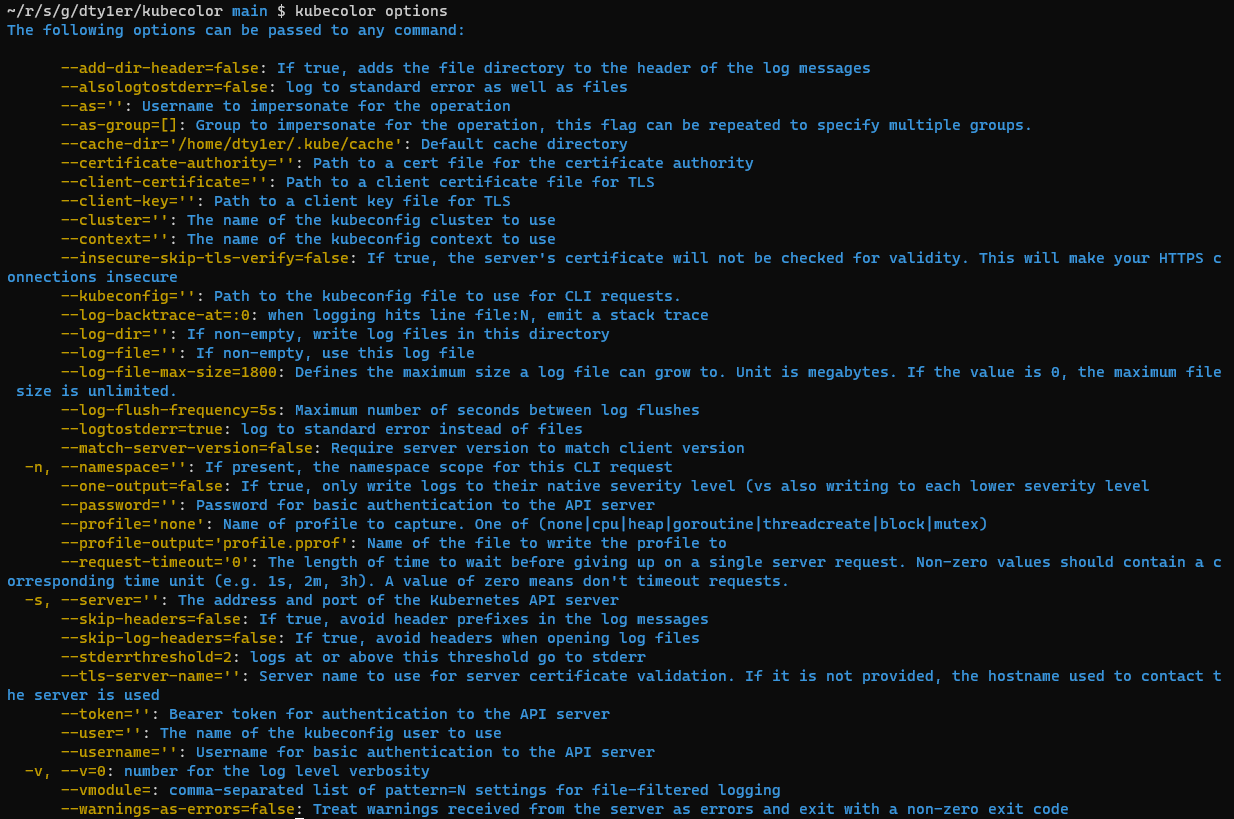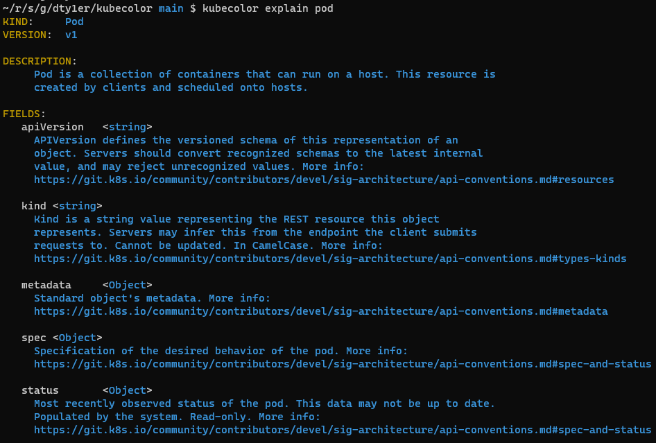 kubectlcommand internally, with given arguments. For example, if you runkubecolor get pods -o yaml, then kubecolor internally runskubectl get pods -o yaml, and captures the output, then colorizes it.Kubecolor first judges if it should do the coloring by isColoringSupported function. If it is judged it should not be colorized, then kubecolor just prints it out.