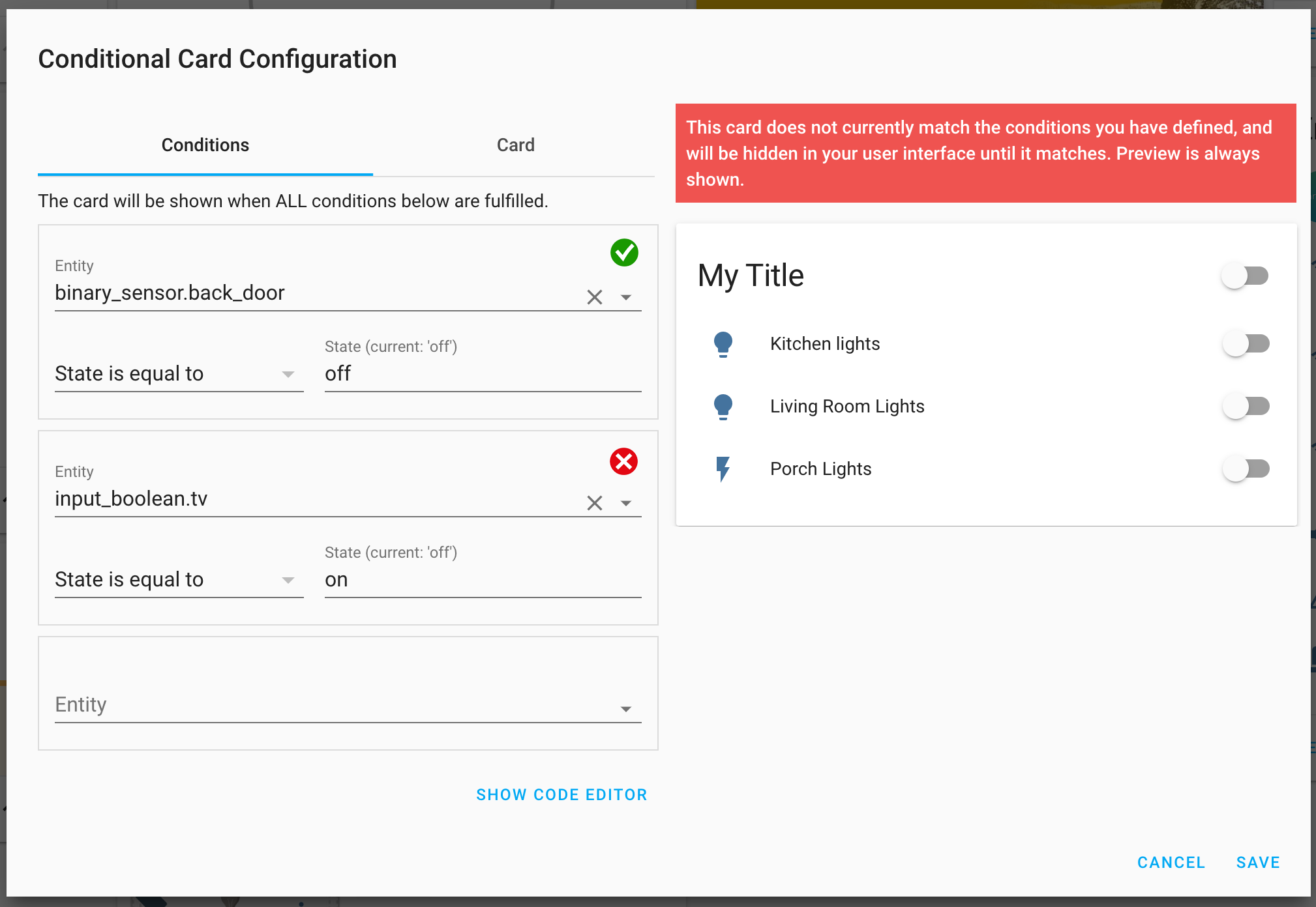 Here's how the Conditional card editor currently looks when the conditions do not match: