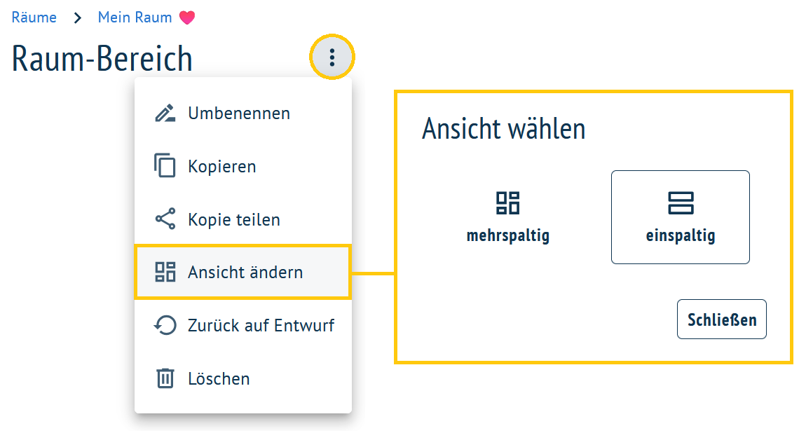 Über das Dreipunkte-Menü innerhalb eines Bereiches ist die Option Ansicht ändern zu finden, mit der sich die Ansicht des Bereichs flexibel ändern lässt.