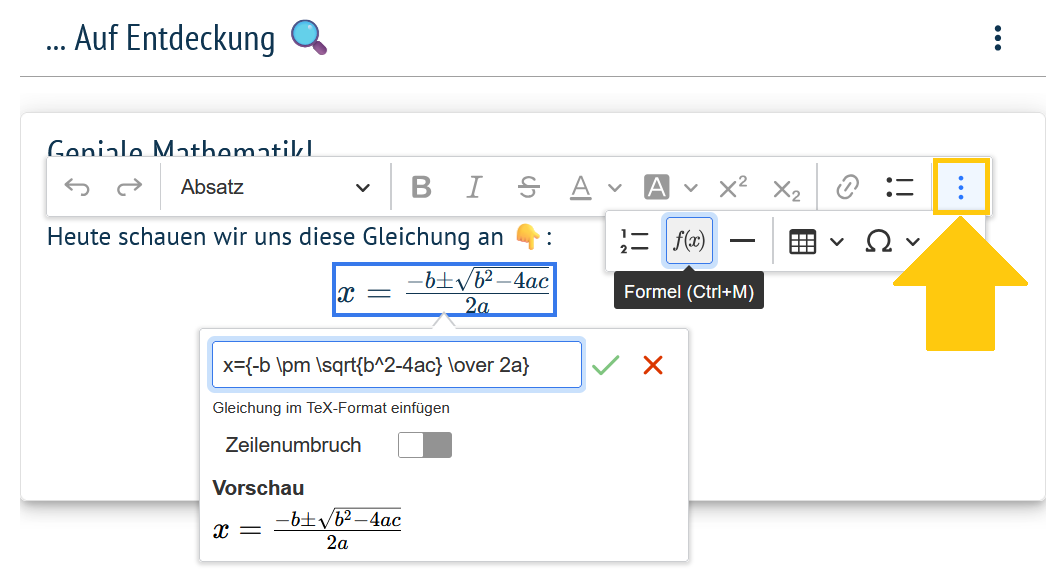 ℹ️ Um eine Formel zu erstellen, muss sie im TeX-Format eingefügt werden. Allgemeine Hinweise und Anleitungen sind auf der Wikipedia-Seite "Hilfe:TeX" zu finden. Auf der Seite Support Table (Katex.org) gibt es außerdem eine Tabelle mit LaTeX-Befehlen und auf der Seite Supported Functions werden diese Befehle mit einfachen Erklärungen und Beispielen gezeigt.
