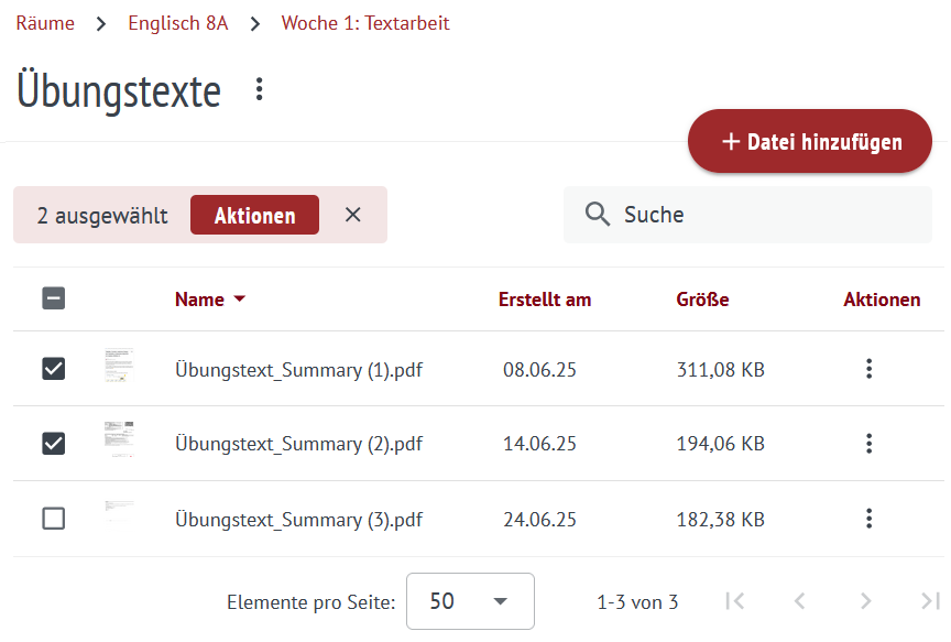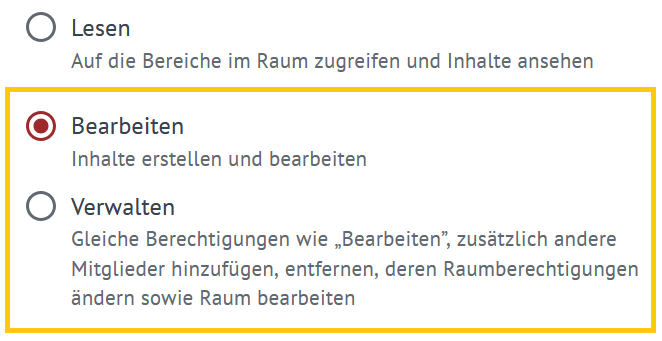 Alle Personen, die Zugriff auf einen Bereich haben, können dort eingebundene Dateien sehen und öffnen. Um die Dateien auch bearbeiten zu können, braucht es in Räumen die Berechtigung Bearbeiten oder Verwalten.
