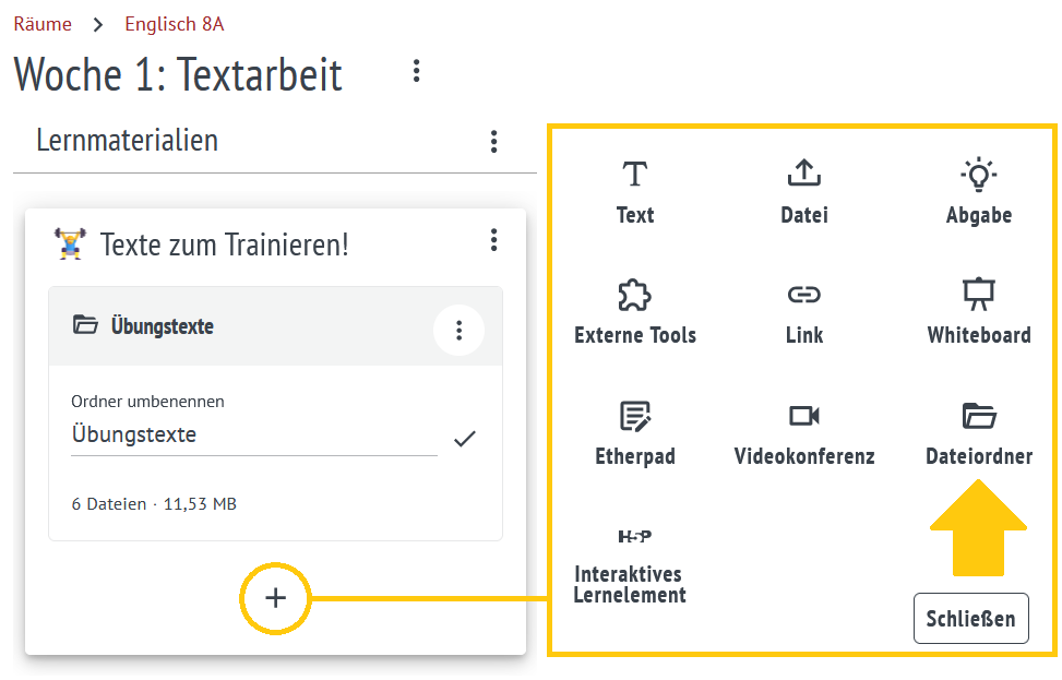 Ab sofort können Dateiordner in Bereichen erstellt werden. Damit wird das Organisieren und Teilen von Materialien noch einfacher und Dateien können zentral an den gewünschten Stellen innerhalb eines Bereichs bereitgestellt werden.