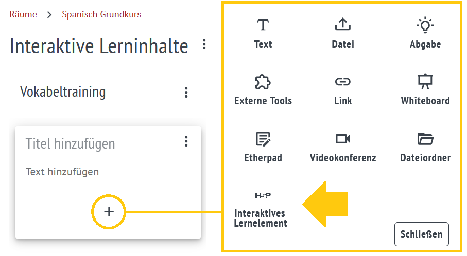 - Option B (Link): Material in der Mediathek suchen, die URL kopieren und als "Link" zum Raum hinzufügen.