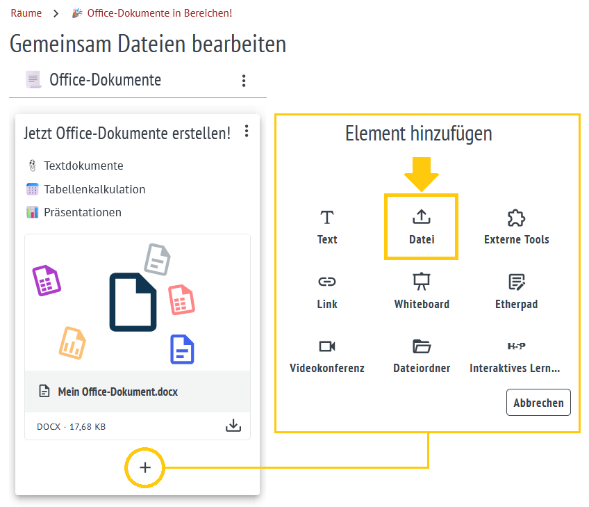 Schon vorhandene Office-Dokumente können auch einer Karte direkt als Datei hinzugefügt werden. Über das Plus-Icon auf einer Karte kann die gewünschte Datei ausgewählt und hochgeladen werden.