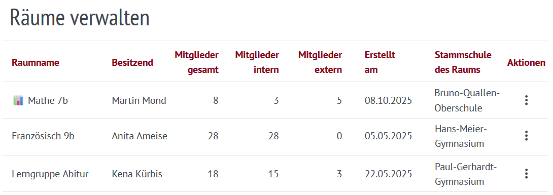- Verwaltung von Raum-Mitgliedschaften – Mitglieder der eigenen Schule können direkt hinzugefügt oder entfernt und Raumbesitzende können – in Räumen der eigenen Schule – benannt werden.