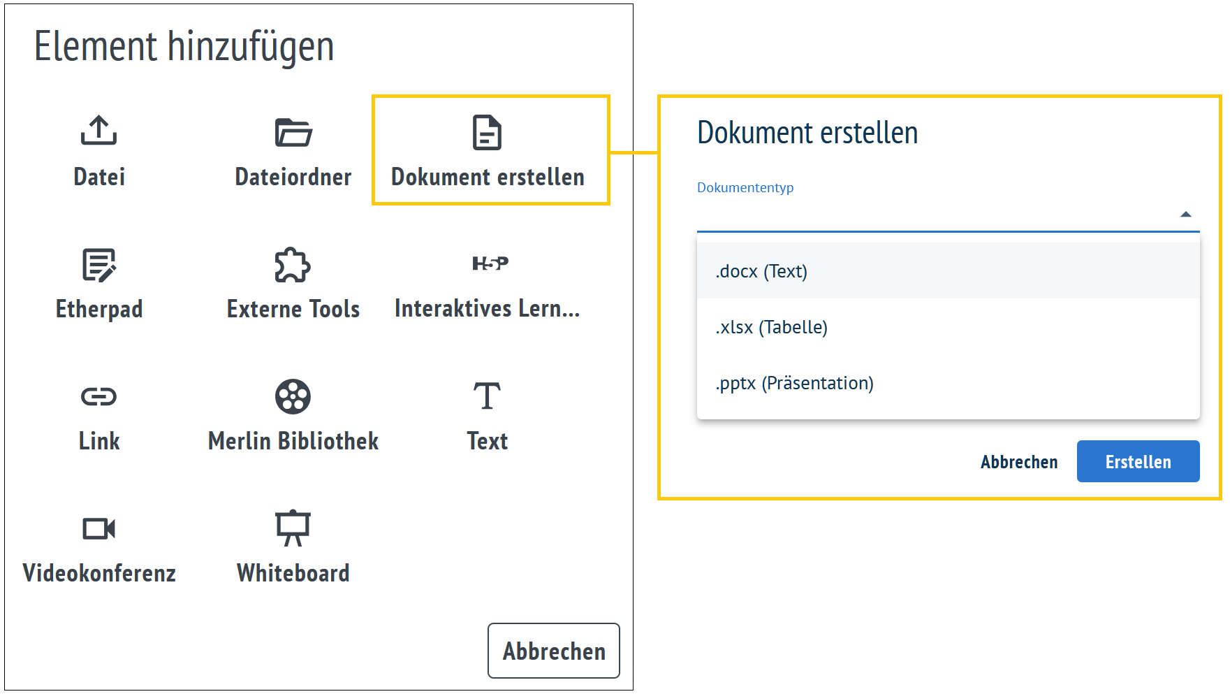 Office-Dokumente können direkt in Bereichen erstellt werden. Über das Plus-Icon auf einer Karte kann mit Klick auf Dokument erstellen direkt das entsprechende Format (Text, Tabelle, Präsentation) erstellt werden.