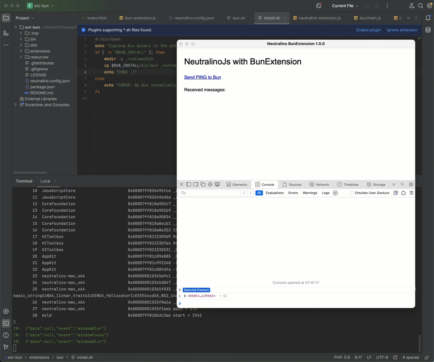 ext.run(processAppEvent);The extension is activated with the last 2 lines. processAppEvent is a callback function, which is triggered with each event coming from the Neutralino app.