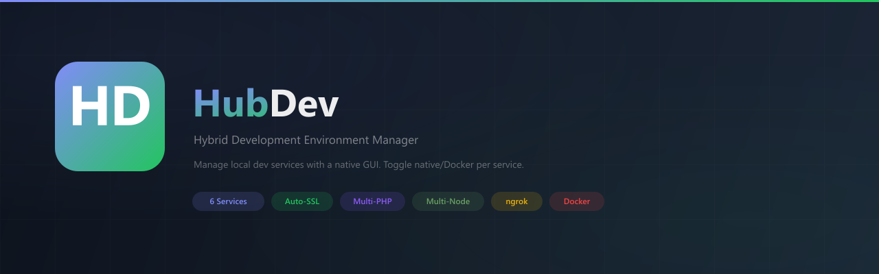 HubDev is a native desktop application that serves as a centralized control panel for local development environments. Instead of opening multiple terminals, memorizing commands, and manually configuring services, HubDev offers a GUI where everything is managed with clicks.