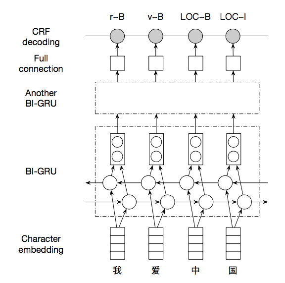 - 字向量序列作为双向 GRU 的输入,学习输入序列的特征表示,得到新的特性表示序列,我们堆叠了两层双向 GRU 以增加学习能力;