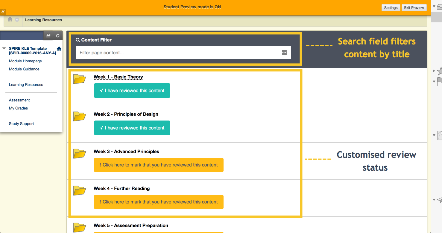 The Content Filter searches the title of each item listed on the page, returning those which match the text provided. As Blackboard only allows a single column view, having the facility to quickly filter content is particularly useful when multiple items are hidden from view.