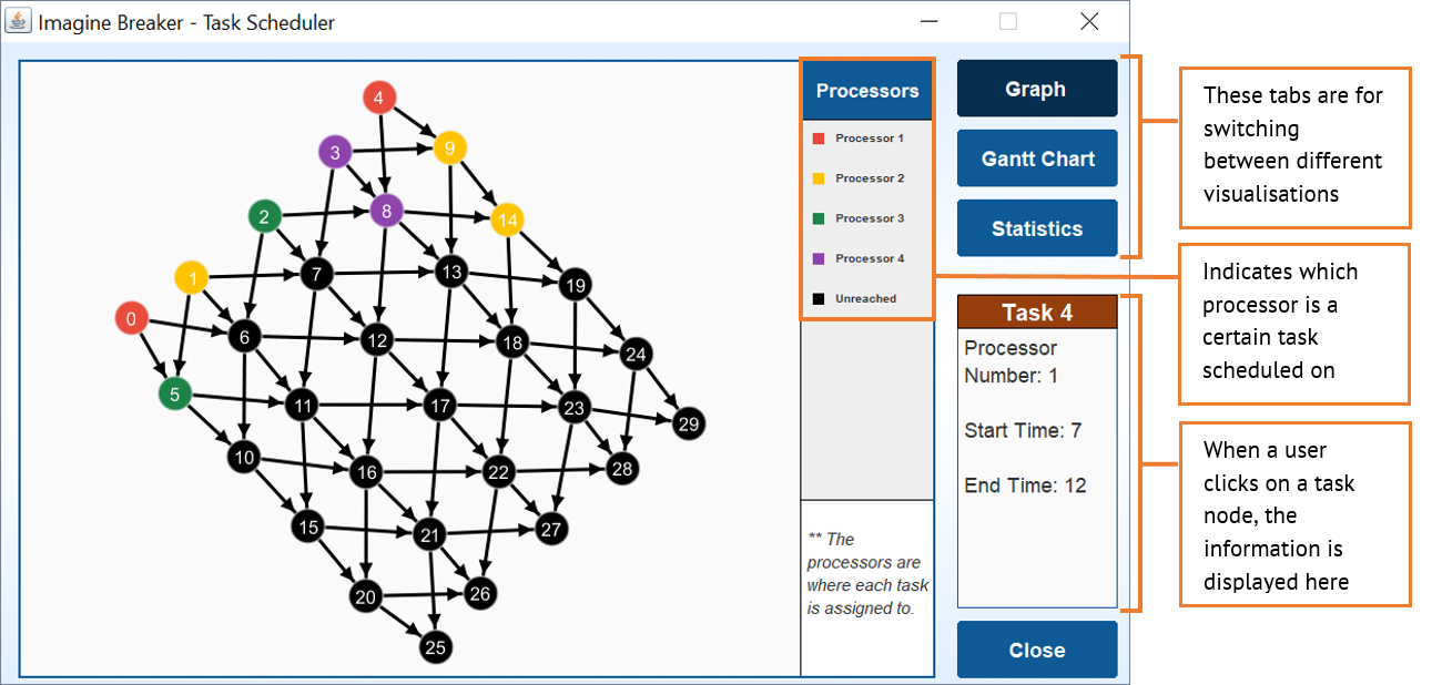 - Each node represents a task and the colour changes based on the processor it is scheduled on.